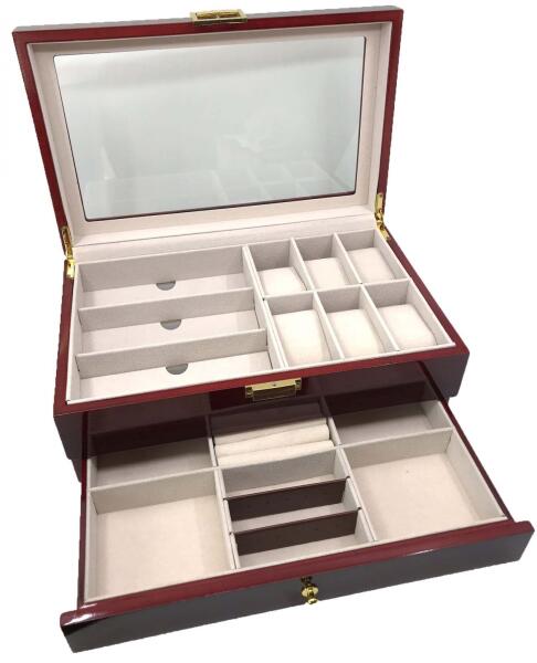 Cutia din lemn Bordo Glam pentru Ceasuri, Ochelari si Bijuterii by Borealy, este ideala pentru doamnele perfectioniste, care doresc organizarea perfecta a bijuteriilor, ceasurilor si ochelarilor de soare, pe care le detin. Avand o culoare bordo, cutia are un design clasic, elegant si rafinat. Caracteristici:Material : lemn Dimensiuni: 34 x 22 x 13 cm Personalizarea Cadoului: poate fi facuta cu placuta aurie, gravata cu laserul, cu mesajul dorit (cost 10 lei), sau prin gravura direct pe produs (cost 25 lei) Termen de executie: 4-5 zile lucratoare PRODUSELE PERSONALIZATE, NU SE RETURNEAZA!