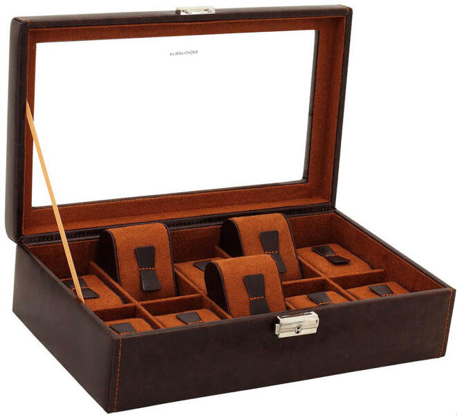 Cutie cu 10 de piese de ceasuri din piele sintetica, culoare maro.