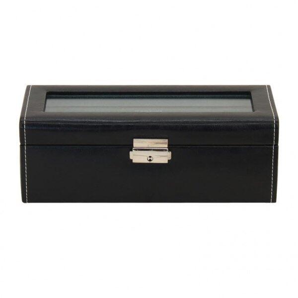 Cutie elegantă pentru 4 ceasuri din piele sintetică culoarea neagră de la brandul german Friedrich Lederwaren. Cutia din colecția Bond este completată cu capac și interior în culoarea albastru deschis, astfel că ceasurile vor fi bine păstrate și ferite de deteriorare. Lățimea unui compartiment este de cca 5,4 cm. Un cadou ideal pentru iubitorii de ceasuri.